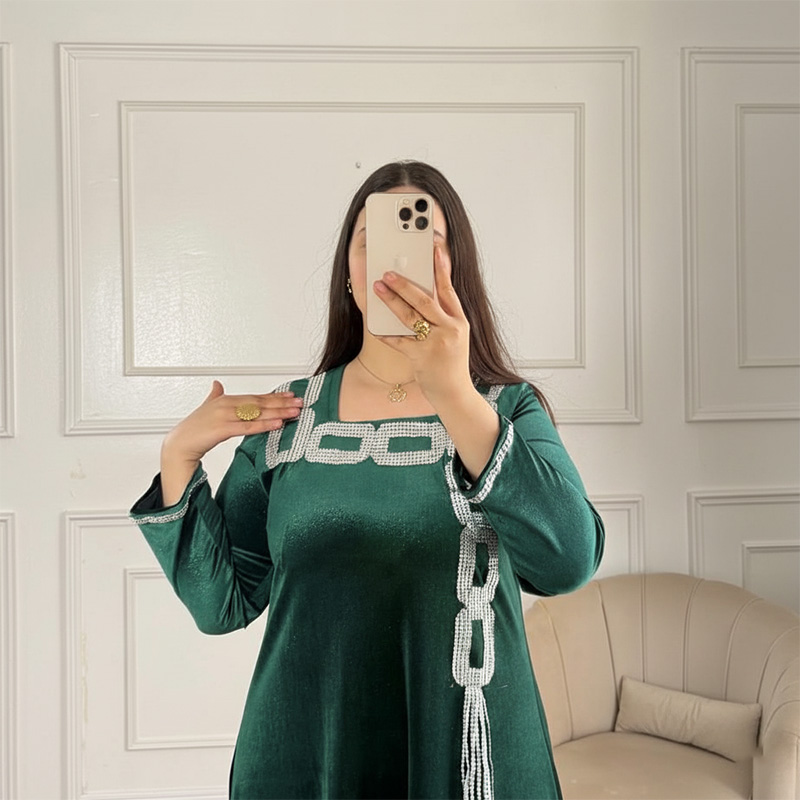إطلالة راقية ومريحة في نفس الوقت مع هذه البيجامة الأنيقة المصممة خصيصًا لمناسبات العيد والزيارات. تتميز بتصميم كلوش واسع بفصالة إيفازي يمنحك انسيابية جميلة وحركة أنيقة، مع تفاصيل زخرفية لامعة تضيف لمسة فخامة مميزة.
